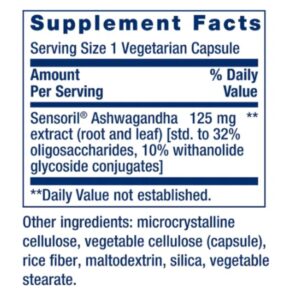 Sensoril® Ashwagandha: 125 mg por cápsula, estandarizado a 32% oligosacáridos y 10% withanólidos. Extracto de raíz y hoja con respaldo clínico.
